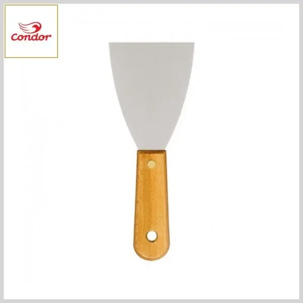 ESPÁTULA CONDOR 867 possui cabo de madeira e lâmina de aço inox. Disponível em 3 tamanhos: 60, 80 e 100mm, é indicada para aplicação de massas e raspagens em geral.