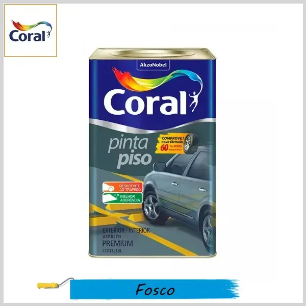 CORAL PINTA PISO é uma tinta acrílica de qualidade Premium, resistente ao tráfego de pessoas e de veículos. É indicada para a pintura de estacionamentos, pisos comerciais, quadras poliesportivas, varandas, calçadas e outras áreas de concreto rústico sujeitas à incidência de ação do sol, da chuva, de constantes atritos e de grande circulação. Possui bom rendimento, ótima cobertura e é fácil de ser aplicada. Sua fórmula contém tecnologia em resinas, que a torna 60% mais resistente que a formulação anterior. Uma lata de 18lt pinta até 275m² por demão.