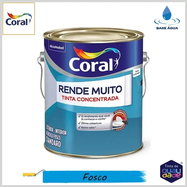 CORALIT RENDE MUITO é uma tinta acrílica de qualidade Standard com acabamento fosco. Por sua alta consistência, permite uma diluição superior aos produtos convencionais. Com diluição maior, entre 50 a 80%, uma lata de 18L permite pintar até 500m² por demão aplicada.